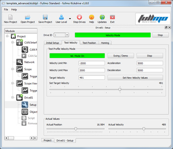 Fullmo Kickdrive ist eine Windows-Anwendung für Konfiguration und Test von CAN/CANopen-Netzwerken, CAN/CANopen Positionier-antrieben und anderen Feldbuskomponenten. Es kann für die unterschiedlichsten Konfigurations-, Inbetriebsetzungs- und Serviceaufgaben eingesetzt werden. fullmo Kickdrive ist einfach zu benutzen, portabel, nahezu beliebig skalierbar, sowie in hohem Masse programmierbar über Python Skript und die Qt Quick GUI-Sprache.