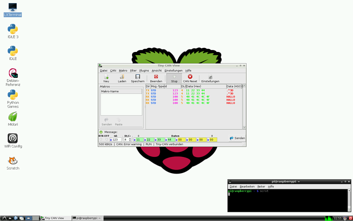 Die Tiny-CAN API Library und das CAN Analyse Tool – Tiny-CAN-Monitor wurden erfolgreich an die Raspberry Pi Hardware (http://www.raspberrypi.org) angepasst.